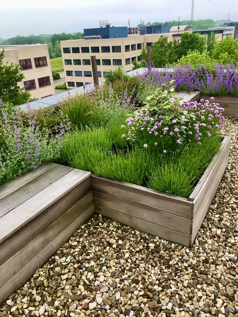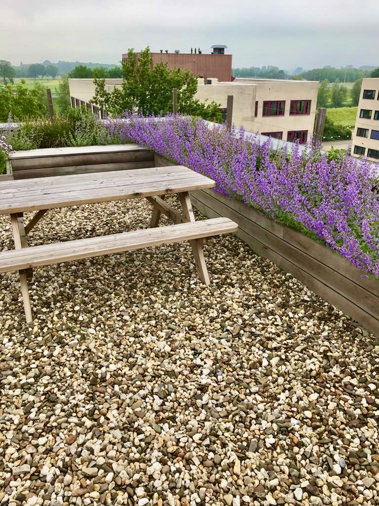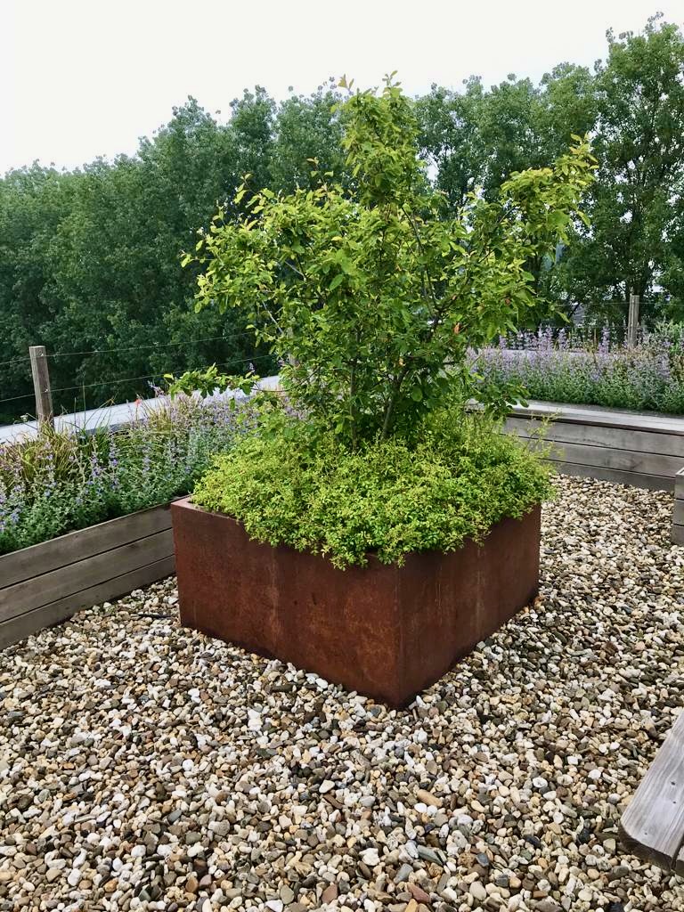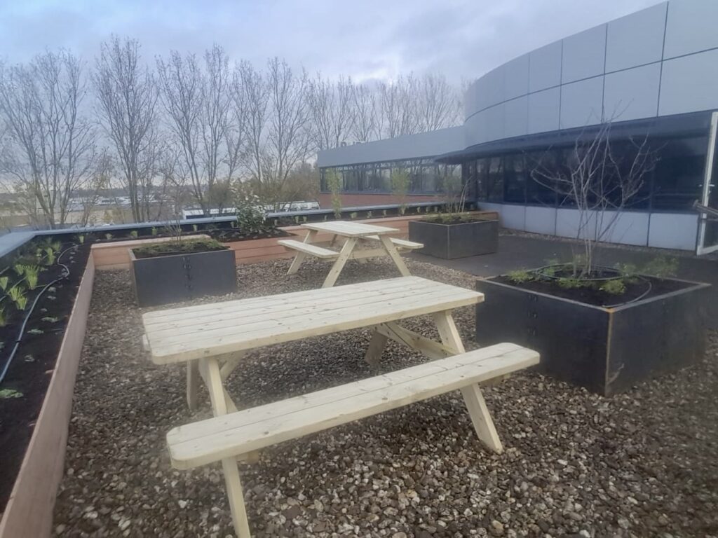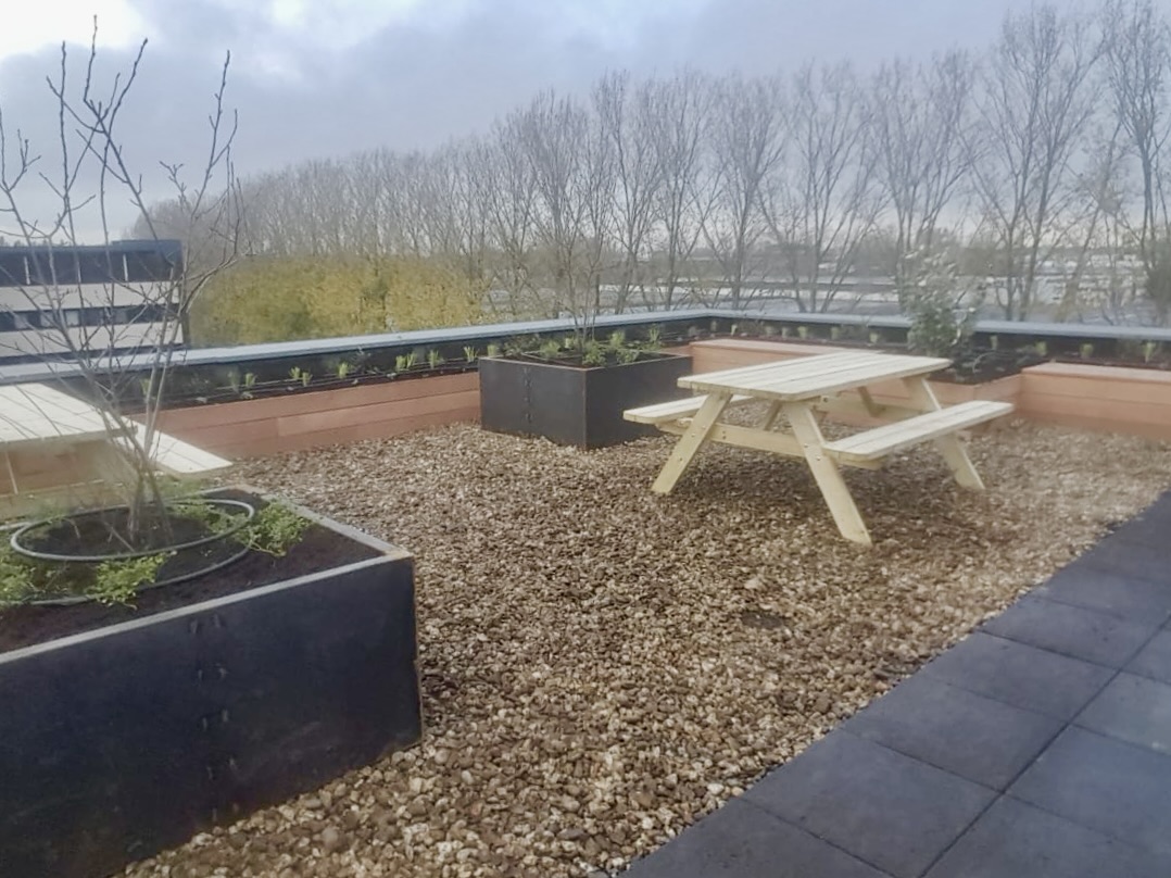 Deze daktuin biedt werkgevers en medewerkers een groene plek om samen te komen, te lunchen, te pauzeren en elkaar te ontmoeten. Met picknicktafels, verhoogde borders met geïntegreerde bankjes en cortenstalen plantenbakken gevuld met een mix van vaste planten en heesters ontstaat er een stijlvolle buitenruimte.