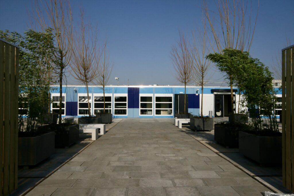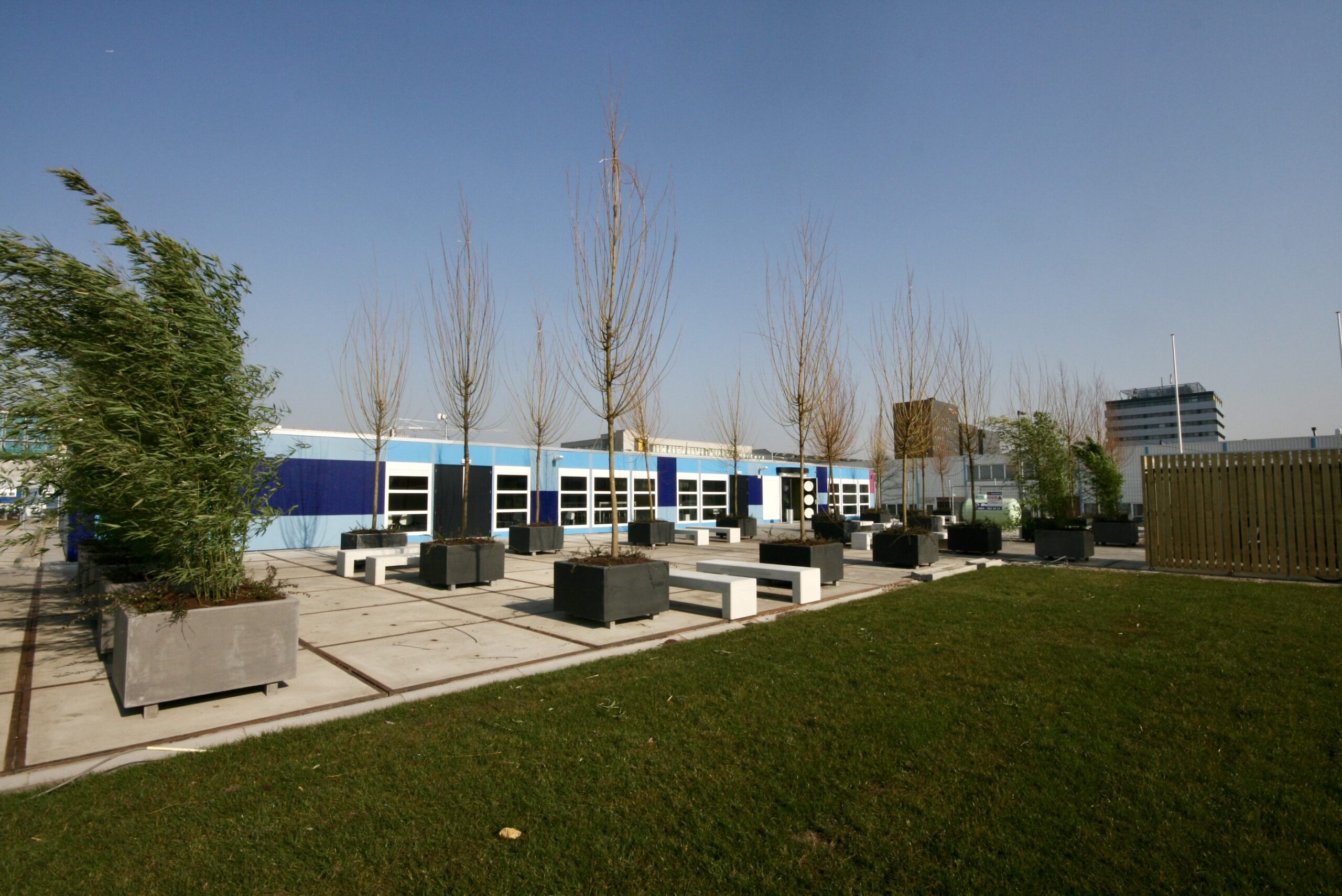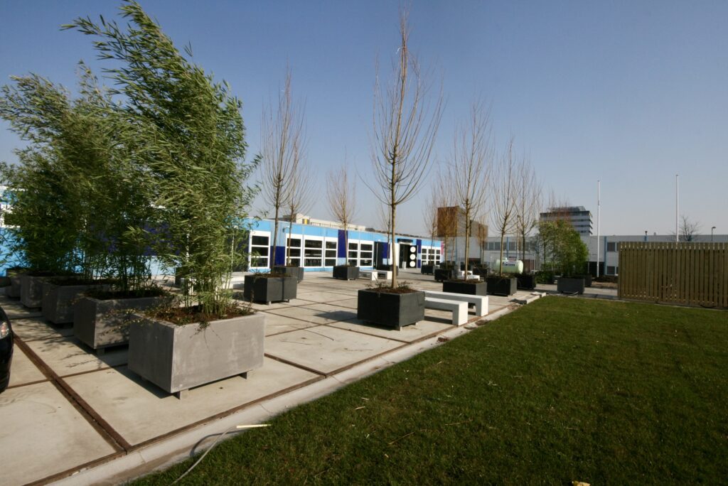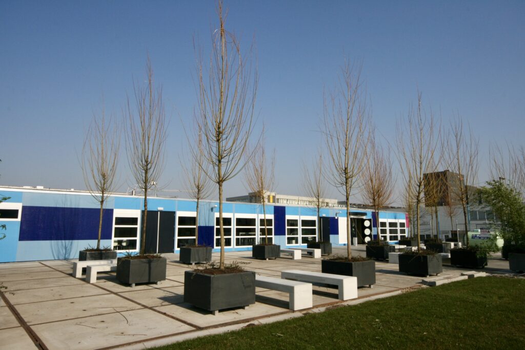 Dit buitenterrein is ontworpen met als uitgangspunten: veiligheid, duurzaamheid en hufterbestendig. Met robuuste betonnen elementen en een doordachte inrichting is er een onderhoudsvriendelijke buitenruimte gecreëerd waar kinderen veilig en vrij kunnen samenkomen.